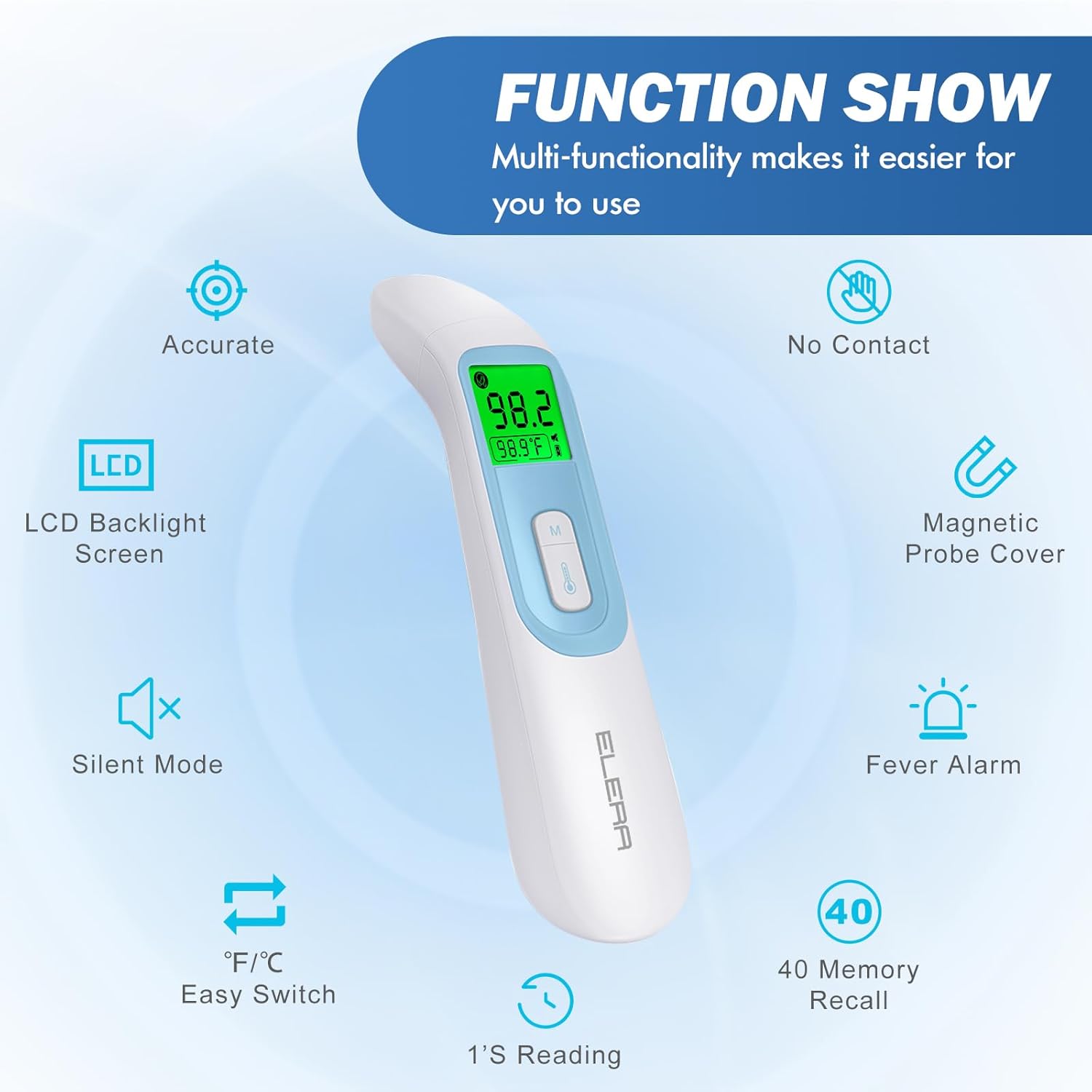 The digital thermometer use the infrared advance and new responsive probe technology making the measurement result quick, accurate and precise. Also including 40 sets of memory, help you record history memory and track temperature trend.