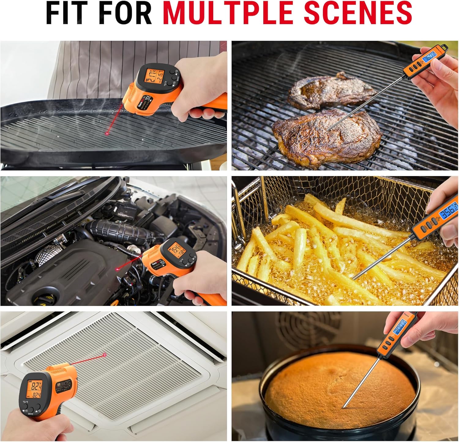 Function with infrare sensor, this surface thermometer is your must-have tool for cooking, BBQ grilling, AC vent or car engine repair, pool, auto and refrigerator maintenance, and more!